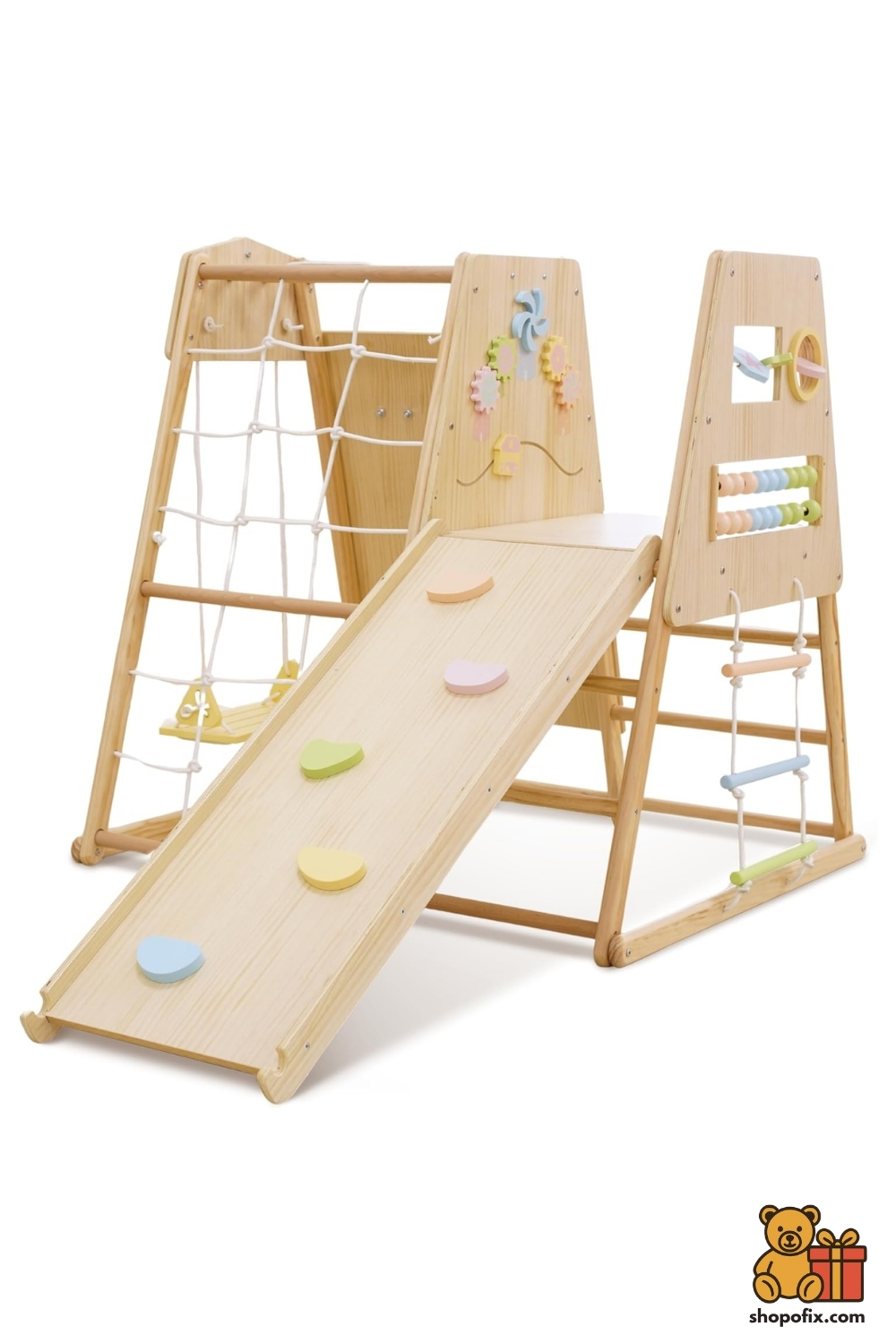 If you’re ready to bring a full playground experience indoors, the Avenlur Cherry 5-in-1 Climber is the ultimate Montessori play gym! This fantastic set includes everything your active toddler needs: a reversible wooden slide with climbing rocks, a rock wall, a rope ladder, a toddler swing, and even a sensory panel with an abacus. It’s perfect for active learning and play while simultaneously encouraging balance, coordination, and gross motor skills.