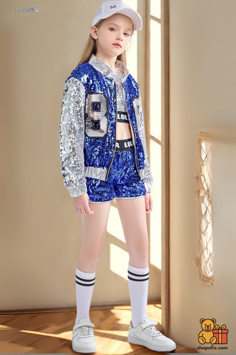 If you want to help your child make a dazzling impression, this sequin dance costume is the perfect choice. This fun 4-piece set includes a jacket, tank top, shorts, and socks, all designed to make them sparkle and shine. The smooth silver metallic fabric on the collar and cuffs perfectly complements the pink sequins, creating a vibrant and eye-catching look. It’s perfect for everything from solo competitions and team performances to birthday parties and carnivals.