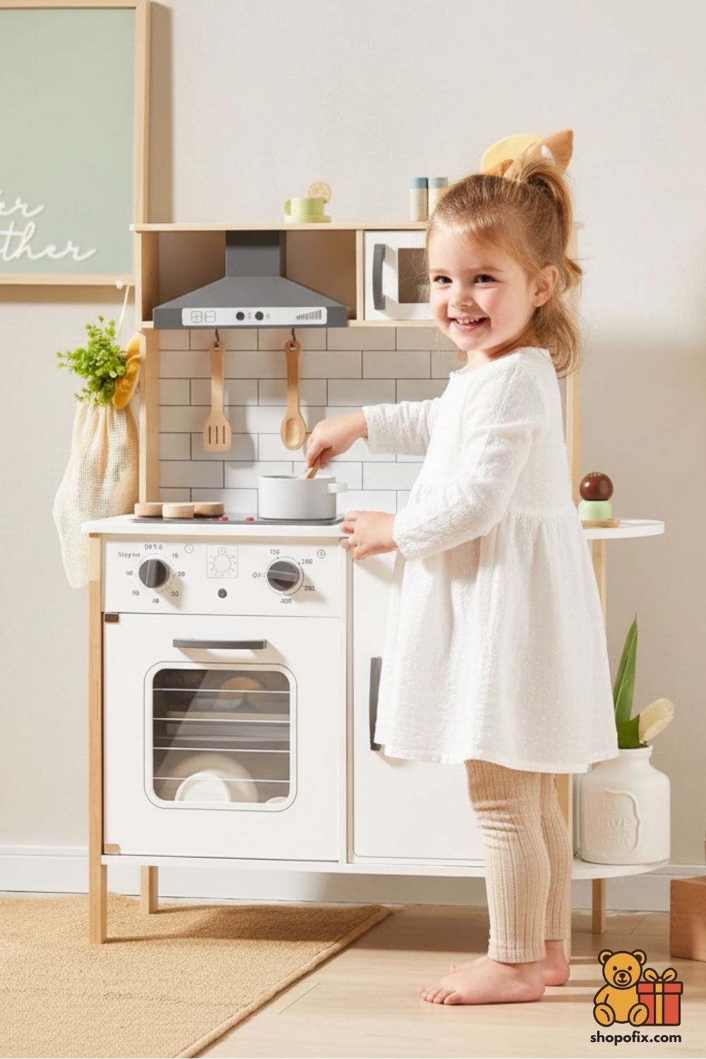 This kitchen is also designed to grow with your child, with adjustable heights that can be set for ages 3 to 7. It comes with a full set of accessories, including a chef hat and apron, so they can start playing right away. It’s a great way to encourage imaginative role-playing, teach them about food, and help develop their social and motor skills in a way that feels completely natural and fun.