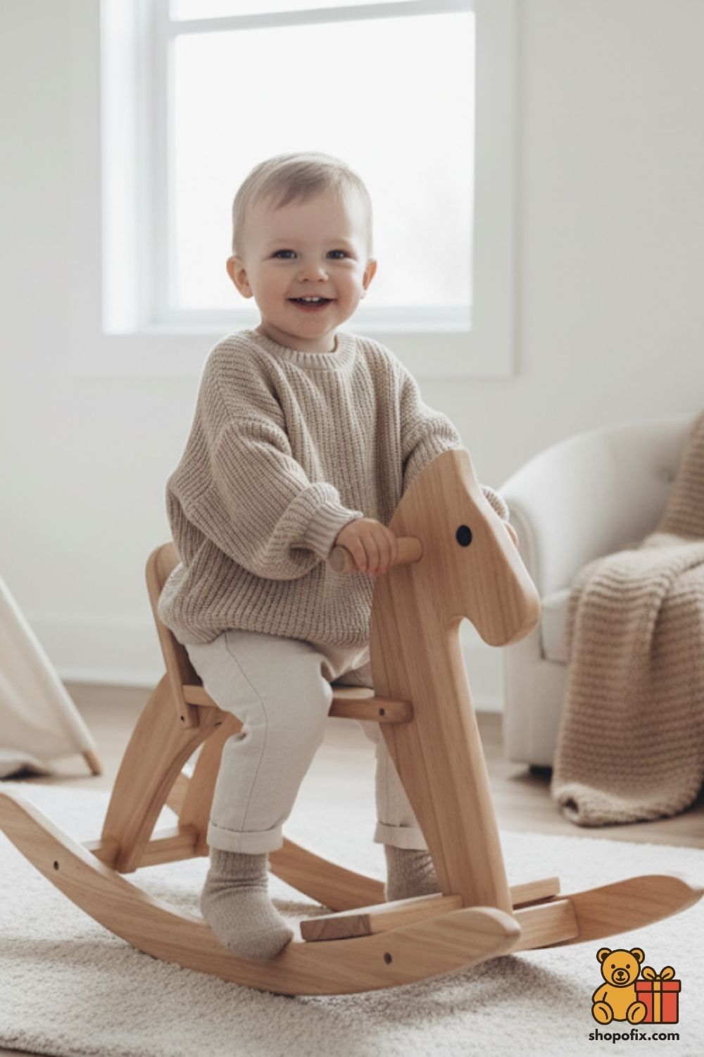A classic rocking horse is a timeless toy that belongs in every playroom, and this wooden one brings a touch of elegant nostalgia. Made from natural pine wood with a smooth, polished finish, it’s designed to be both comfortable and safe for toddlers. The low center of gravity and gentle rocking motion ensure a stable ride, giving you peace of mind while your child has a blast. The addition of a foot pedal is a thoughtful detail that provides extra security, letting your child rock away without a care in the world.