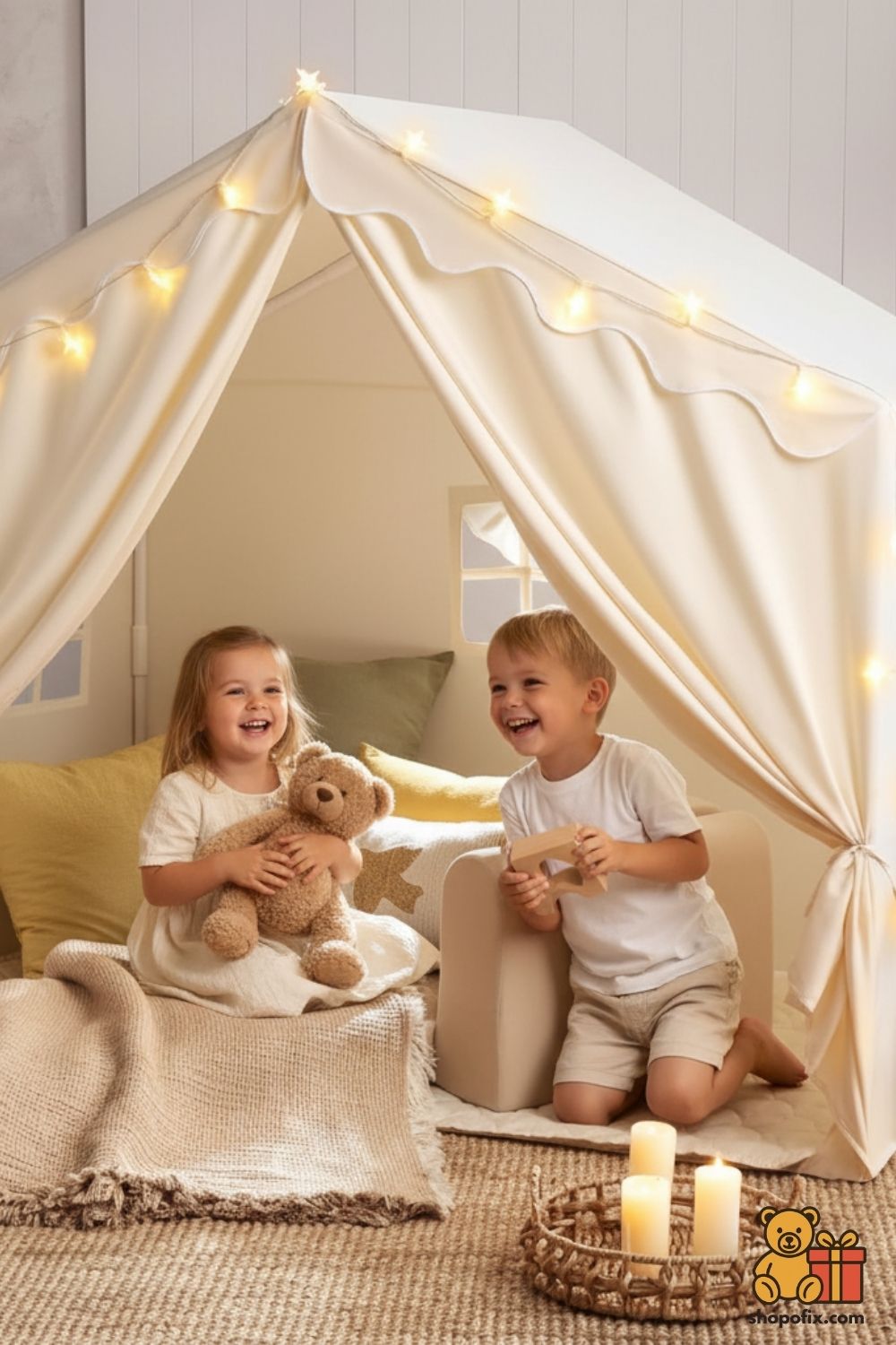 This play tent is the perfect way to create a cozy, magical corner for your little one without compromising on your home’s aesthetic. Forget those loud, plastic tents; this one is made from soft, breathable fabric in a soothing, neutral color that will blend right in with your decor. It’s a wonderful, private space where your child can read, relax, or just have a moment to themselves. Plus, the included star string lights add a dreamy, enchanting touch that makes it feel extra special.