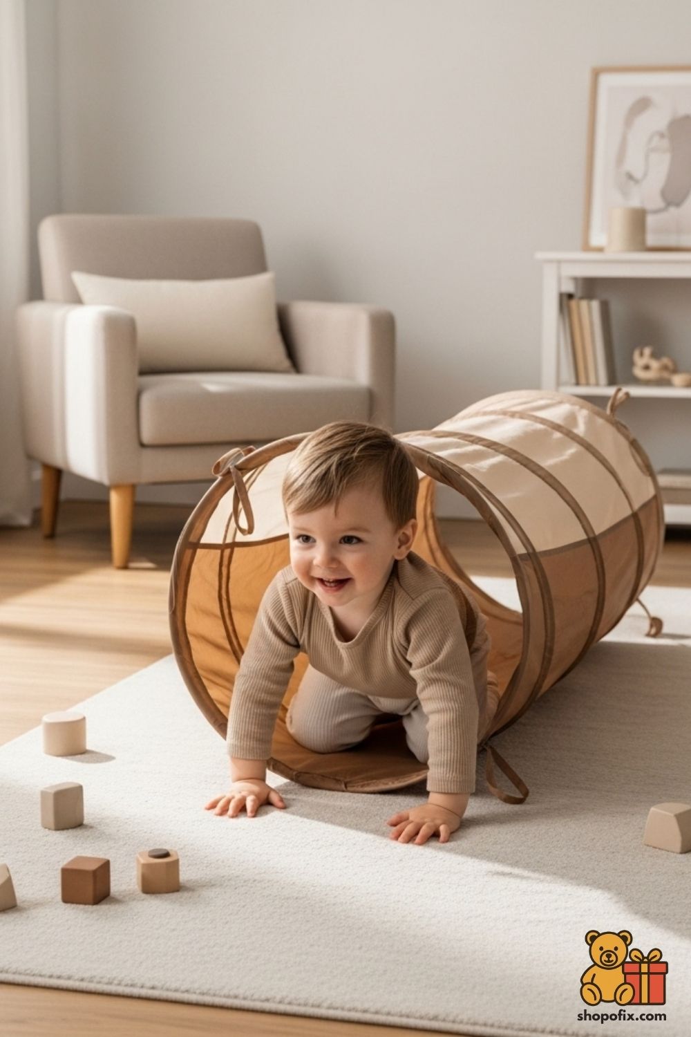Say goodbye to garish primary-colored play tunnels that stand out like a sore thumb in your living room. This toddler tunnel is a fantastic find for any parent who values a clean aesthetic. Made from soft, breathable, and durable peachskin fabric, this pop-up tunnel comes in a pure beige color with a subtle star pattern. It blends seamlessly into your home while providing endless fun for your little one, whether they’re crawling through it or using it as a cozy hideout.